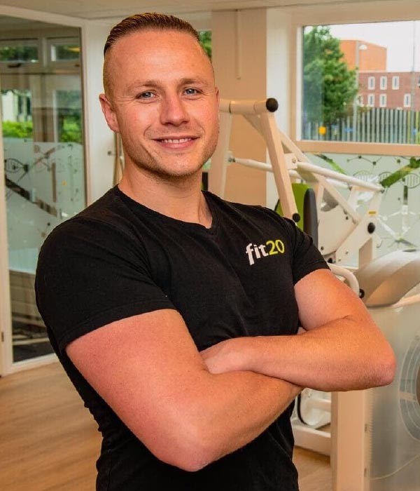 Lächelnder fit20 Personaltrainer mit verschränkten Armen im Fitnessstudio. Ihr Experte für effektives Training und gesunde Ernährung.