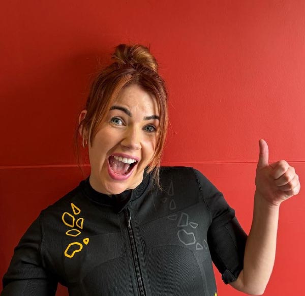 Motivierte Frau im Sport-Look zeigt Daumen hoch, begeistert von Fitness & Ernährung.